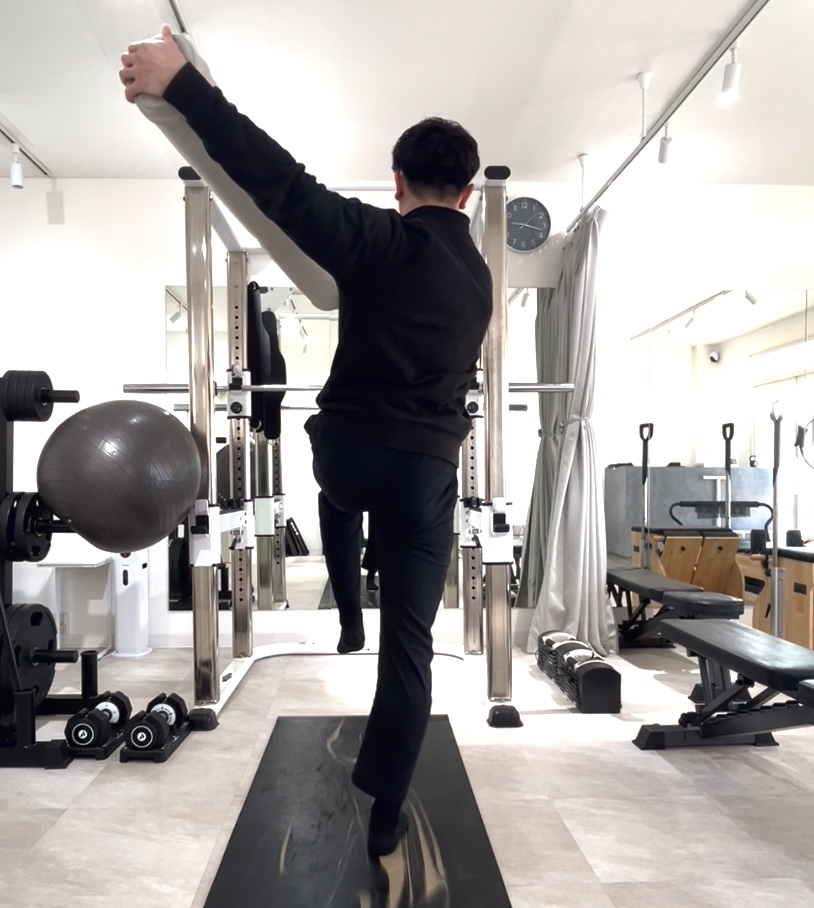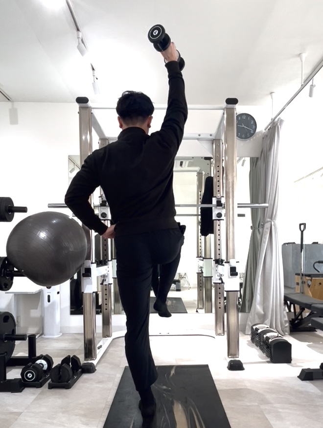 - 腕の動作: 脚を後ろに下げ、前方に持ち上げる際に片手をを頭上へまっすぐ持ち上げる。