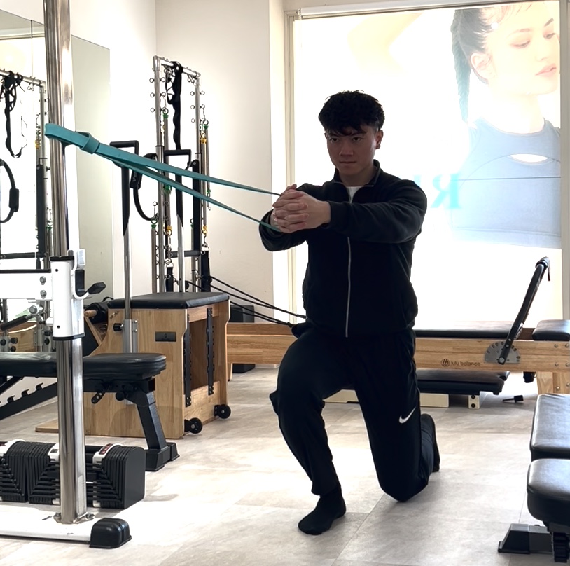 足を後ろに引く際、腰が反ったり丸まったりしないよう、お腹の圧力を維持する。