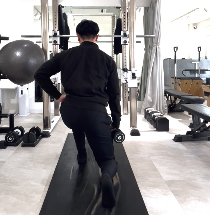 - ランジ: 右足を大きく後ろに引き、両膝を約90度に曲げる。この時、前脚の膝が爪先より前に出ないようにする。