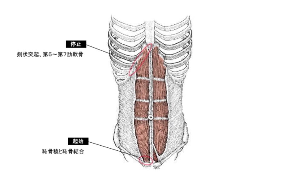 腹直筋:骨盤の恥骨(恥骨結合・恥骨稜)から始まり、上方の胸骨剣状突起と第5~7肋軟骨に停止する。