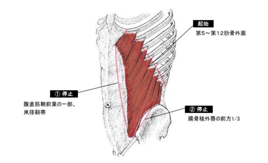 外腹斜筋:骨盤の恥骨(恥骨結合・恥骨稜)から始まり、上方の胸骨剣状突起と第5~7肋軟骨に停止する。
