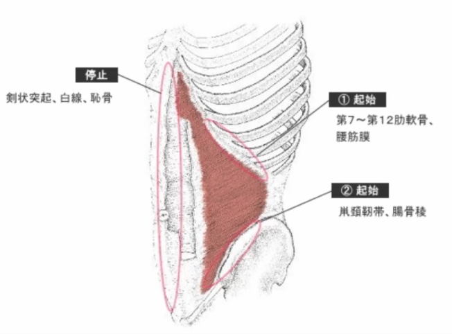 内腹斜筋:骨盤側の腸骨稜や胸腰筋膜から起始し、第10~12肋骨および腹直筋鞘・白線に停止する