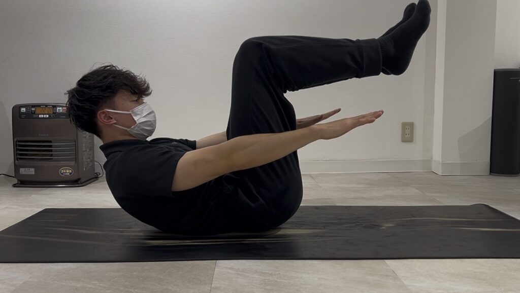 - 両手は後頭部を支えるか、床と並行に前に伸ばす。