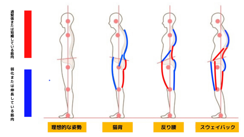 この中で特に背中が丸く見える姿勢は、「スウェイバック」と「反り腰」です。