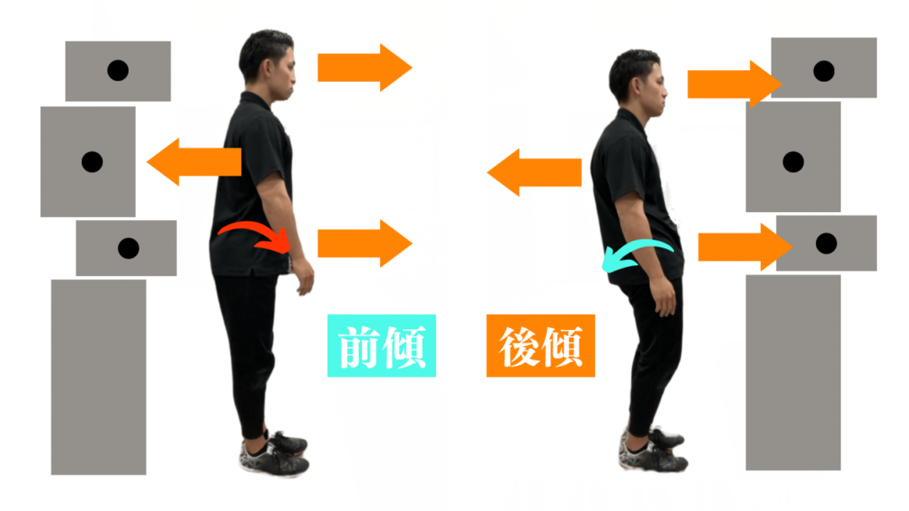 スウェイバックの場合は骨盤が後傾と前方移動することで、股関節が伸びきった状態になります。その前後のバランスを取るようにして胸部を後方へ移動し、頭部を前方へ移動して前後のバランスを取ります。