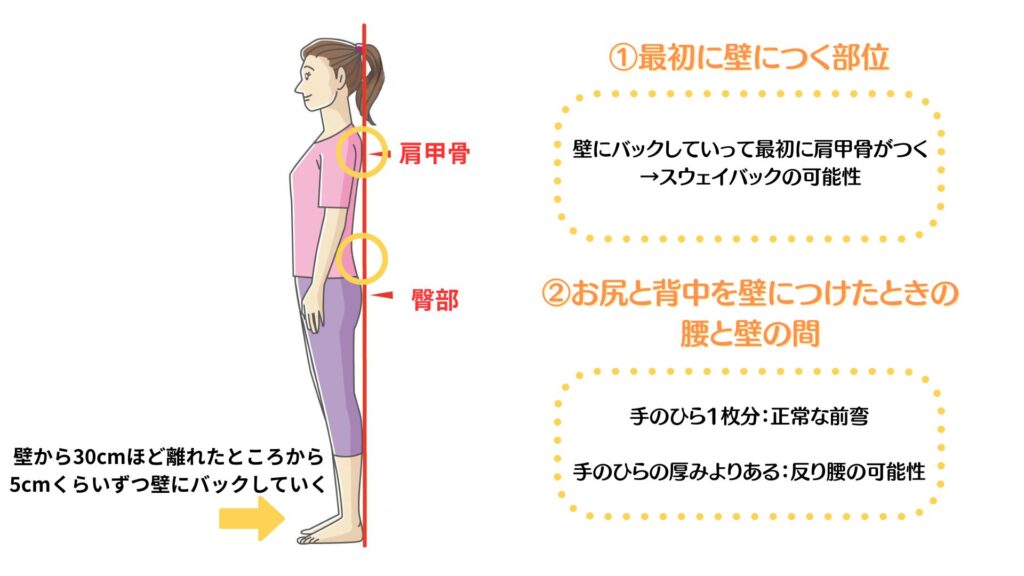 - 体の一部が壁についたら止まります→肩甲骨が先についたらスウェイバックの可能性、お尻が先についたら反り腰の可能性あり