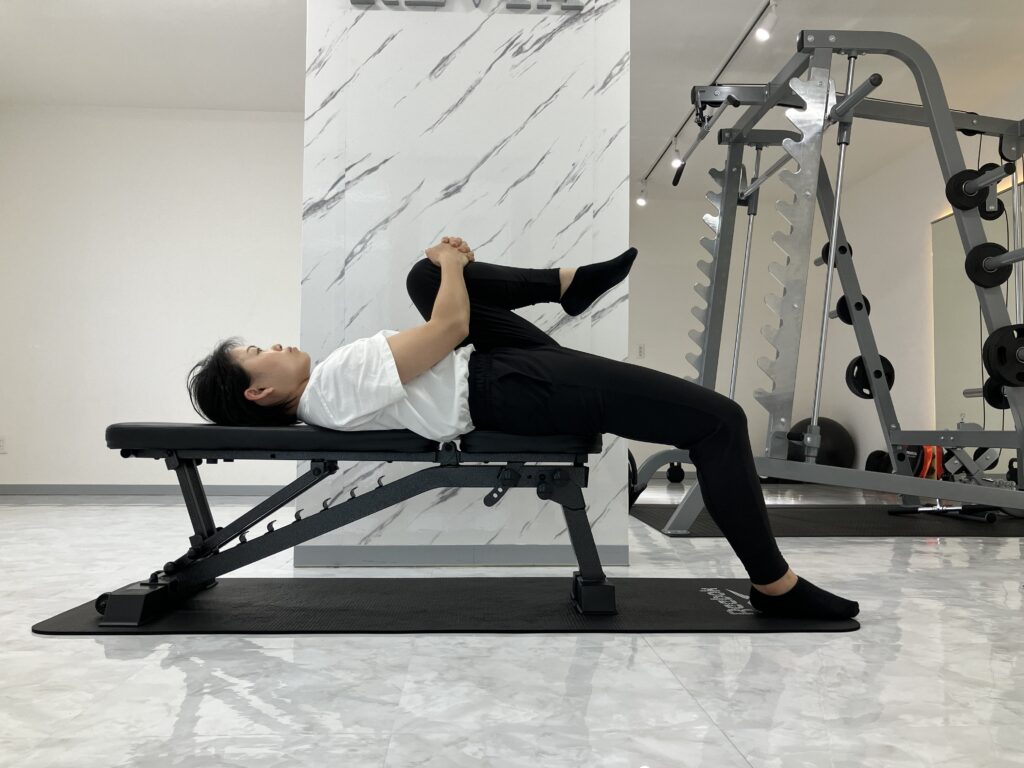 3.骨盤が浮かないように床に押し付けたまま、抱えた膝を胸に近づけていく
