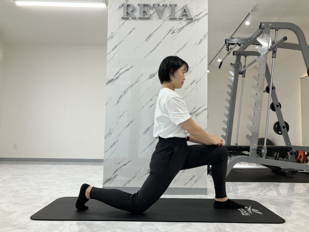 1.片膝を床につけ、反対脚を前に出して90度に曲げる