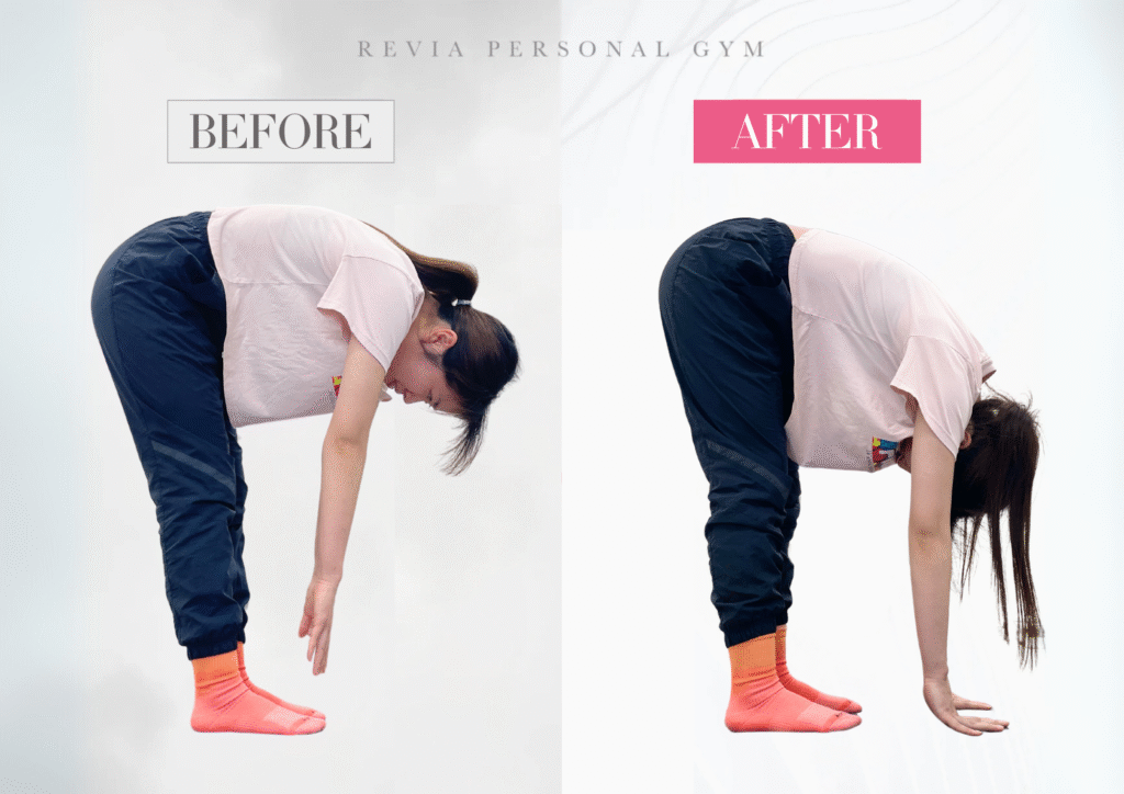 【お客様成果事例】女性専門パーソナルジムREVIA守谷店のお客様、前屈が1回のセッションで手が着くまでに変化!