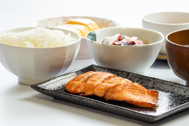 – サーモンの焼き物 (たんぱく質とオメガ3脂肪酸): 150g